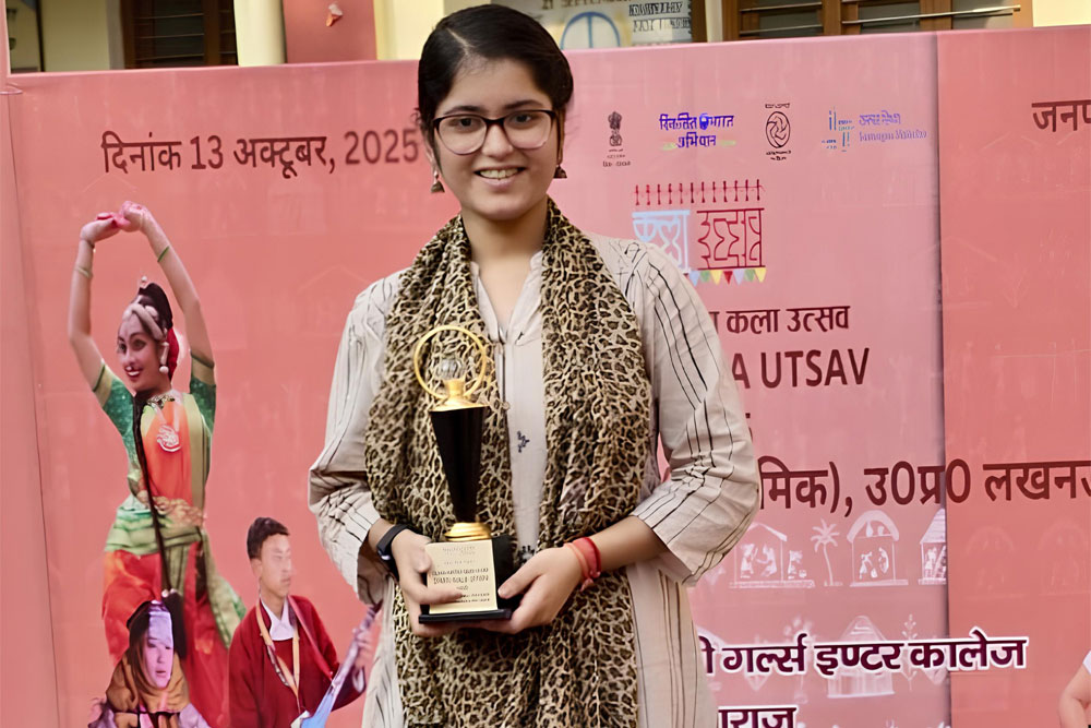 Debapriya Maiti of Class XI won second prize in the UP-state level Hindustani Classical Vocal Music at Kala Utsav, held at Prayagraj. She presented Raag Vrindavani Sarang, a beautiful devotional raga. The competition showcased 30 talented singers. Kala Utsav is a unique programme of the Department of School Education and Literacy (DSE&L), Ministry of Education (MoE), designed to foster and showcase the rhythmic talent of school students.