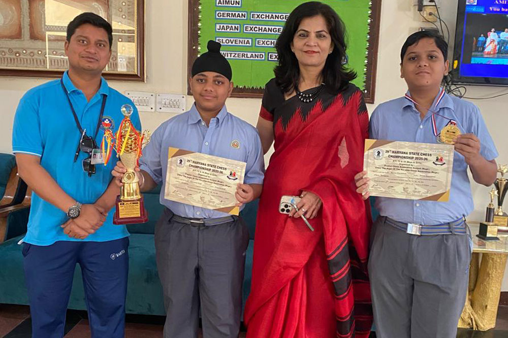Students secured first and fifth positions at the Haryana State U-19 Chess Championship, organised by the Haryana State Chess Association at SRM University, Sonipat. Arshpreet Singh (XII) clinched first position with a ₹3000 cash prize, while Naman Khandelwal (IX) secured fifth position with a ₹1000 cash prize in the state-level competition. The championship witnessed participation from 86 players, with winners receiving medals and trophies.