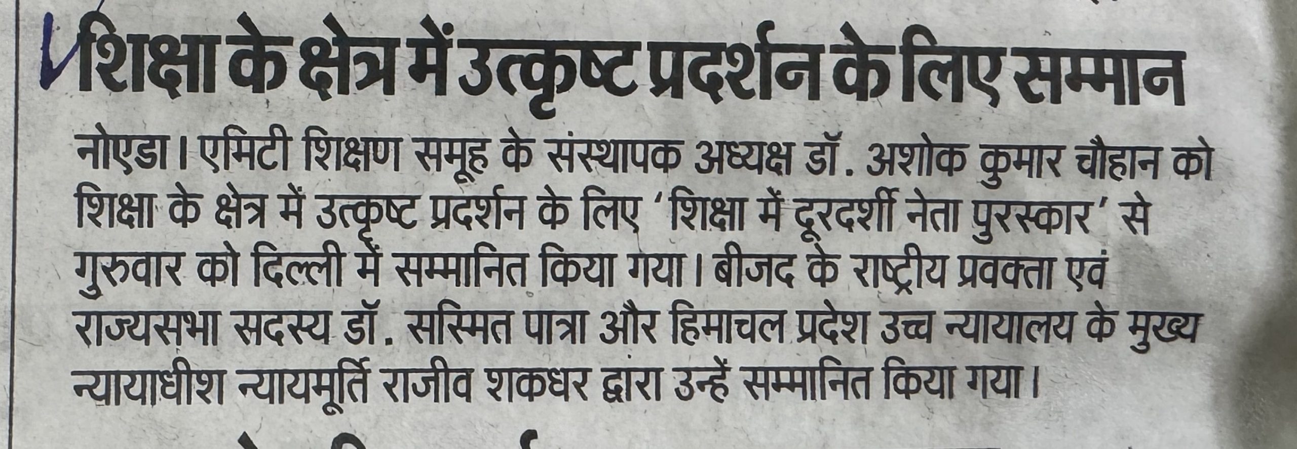 Hindustan Times Dr. Ashok K. Chauhan, Founder President, Amity Education Group was felicitated with the ‘Visionary Leader in Education Award–2025’ by Rajya Sabha member Dr. Sasmit Patra and Himachal Pradesh High Court Chief Justice Rajiv Shakdher for for his exceptional contribution and farsighted leadership in higher education.