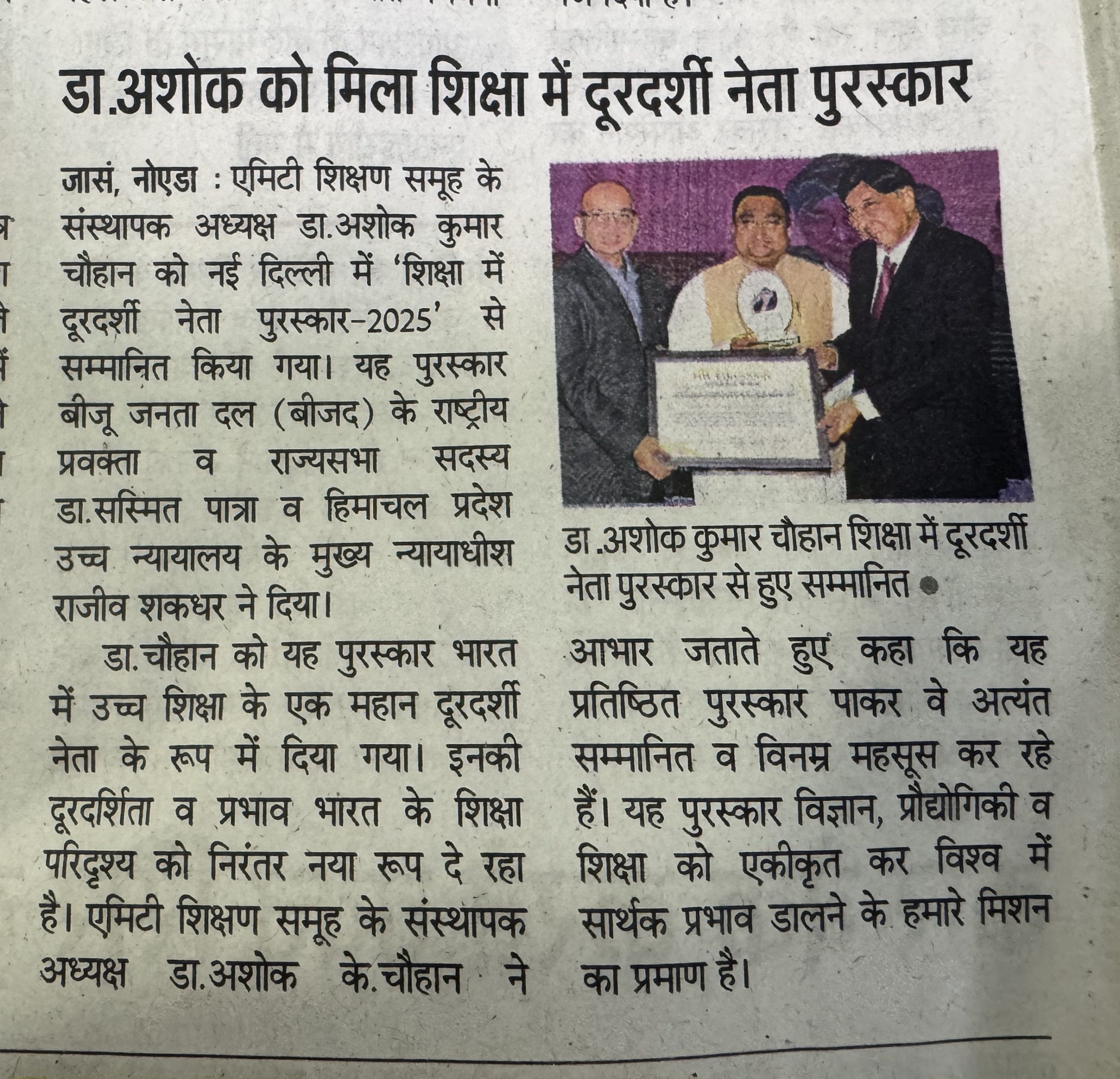 Dr. Ashok K. Chauhan, Founder President, Amity Education Group was felicitated with the ‘Visionary Leader in Education Award–2025’ by Rajya Sabha member Dr. Sasmit Patra and Himachal Pradesh High Court Chief Justice Rajiv Shakdher for for his exceptional contribution and farsighted leadership in higher education.