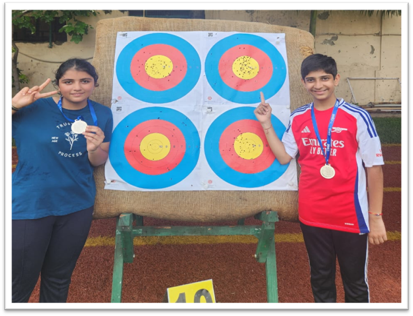 Proud moment! Aryavardhan Kumar Chauhan (9A) & Pearl Sharma (8A) clinched the Silver Medal in the U-17 Compound Mixed Team category at the CBSE Archery Tournament 2025 – Central Zone (Delhi Region) held on 12th Aug 2025!